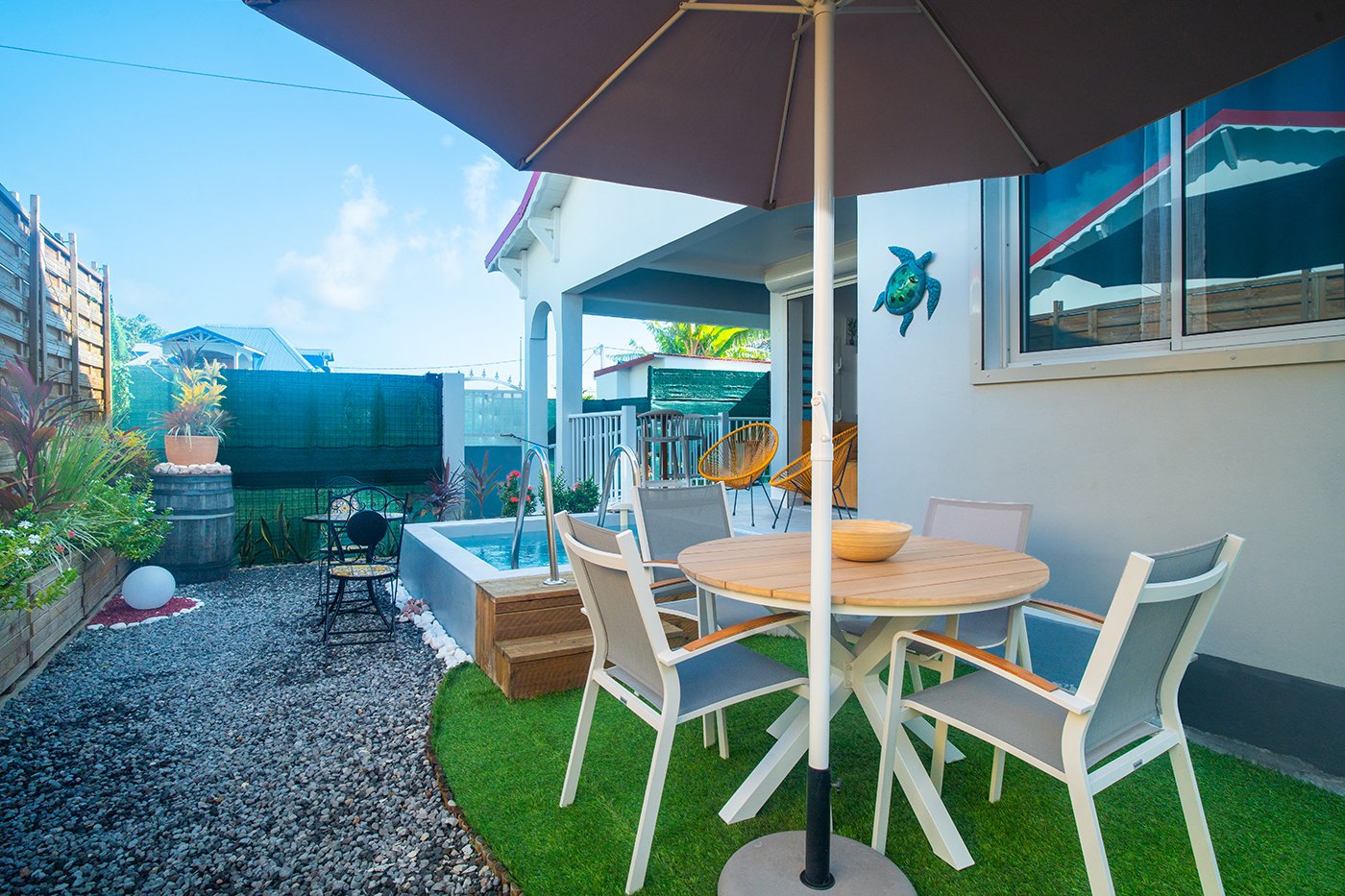 Avec sa terrasse privée et sa petite piscine donnant sur un jardin tropical, ce gîte marie charme créole et confort moderne.
