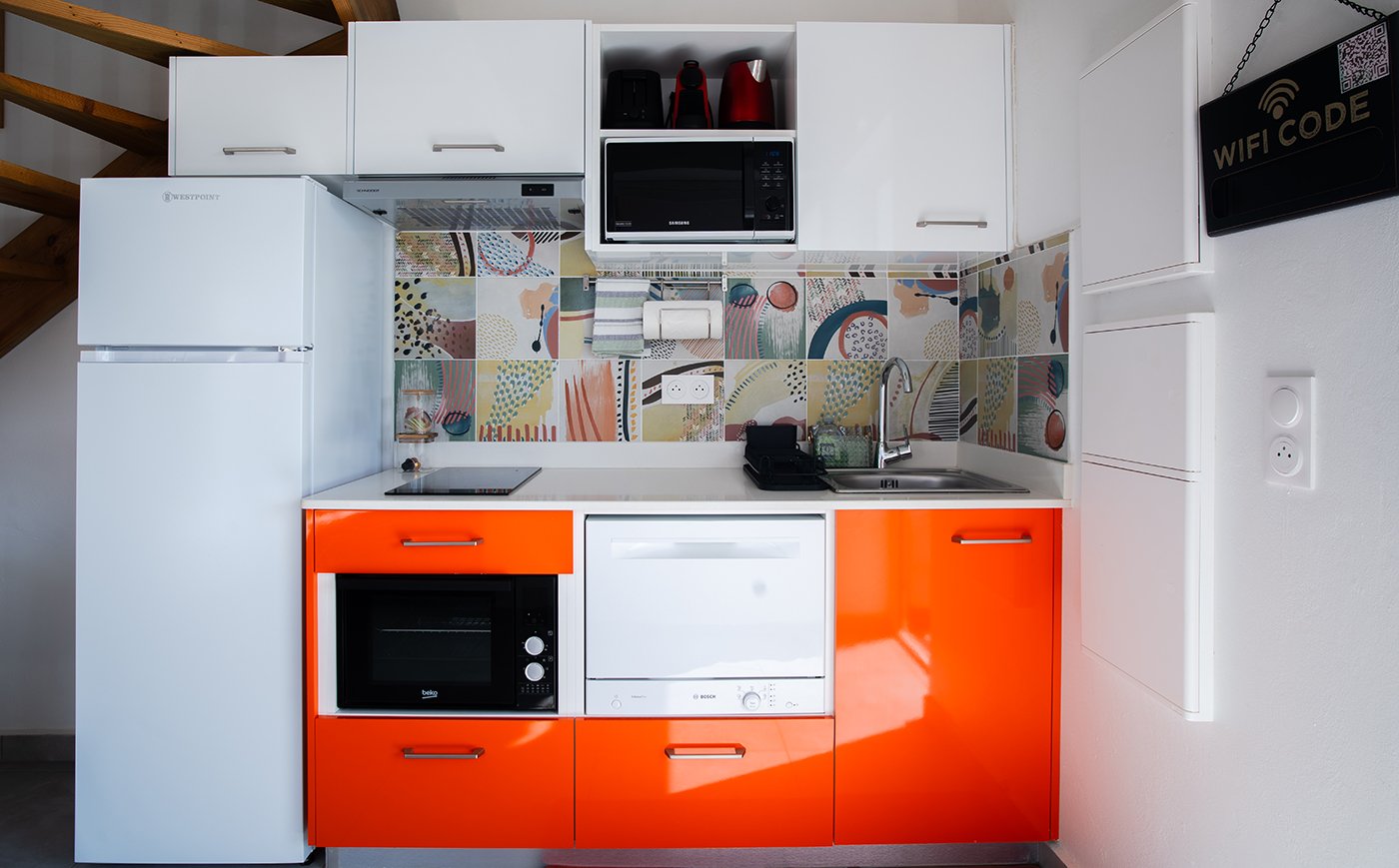 - Cuisine équipée : réfrigérateur, micro-ondes, plaque induction, four, lave-vaisselle
